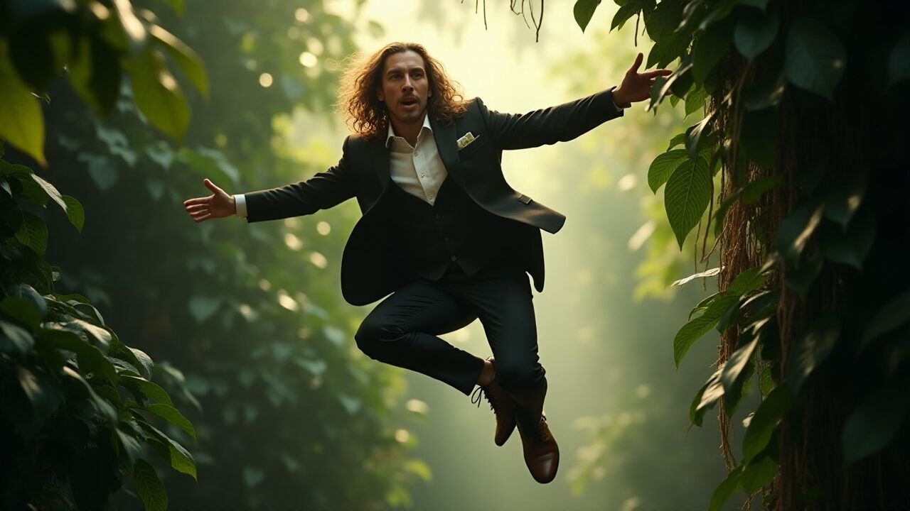 Imagem: Tarzan, de terno, pulando na floresta. Gerada por IA.